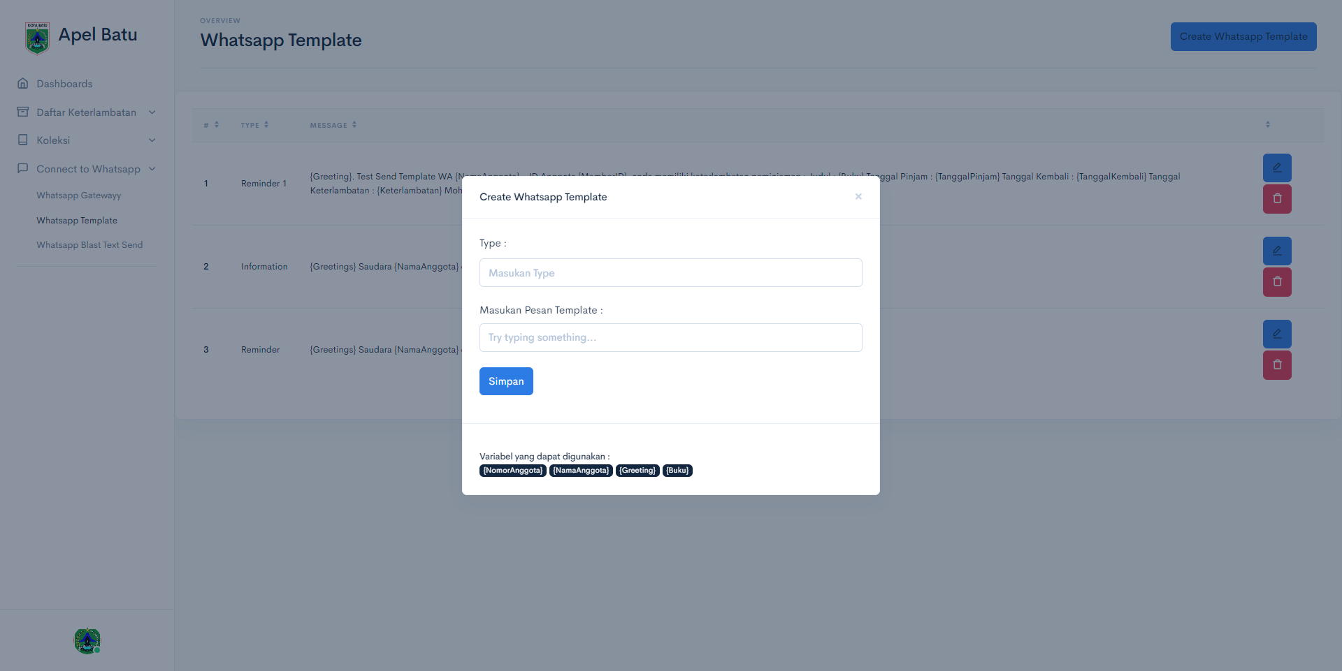 Dari permasalahan tersebut dibuatlah aplikasi WhatsApp Gateway yang bernama Apel Batu yang menyediakan fitur reminder pengembalian buku agar anggota mengembalikan buku tepat waktu. Selain itu sistem ini juga menyediakan fitur promosi buku dan broadcast informasi melalui WhatsApp.