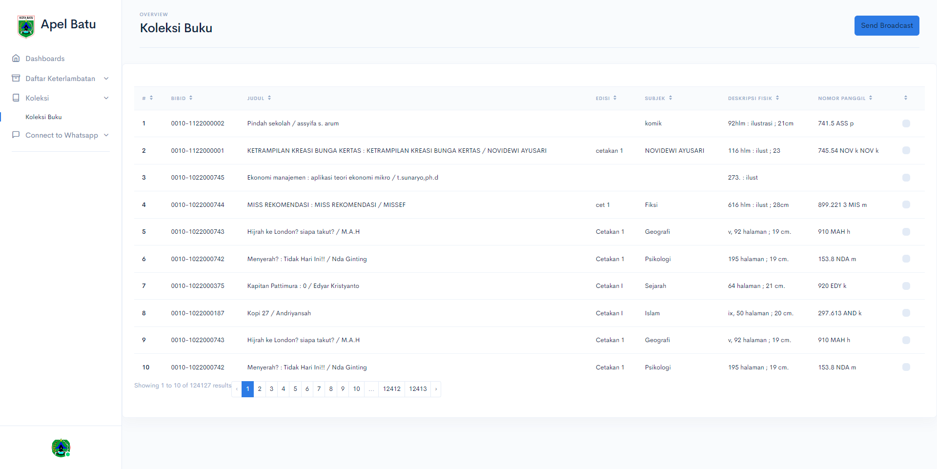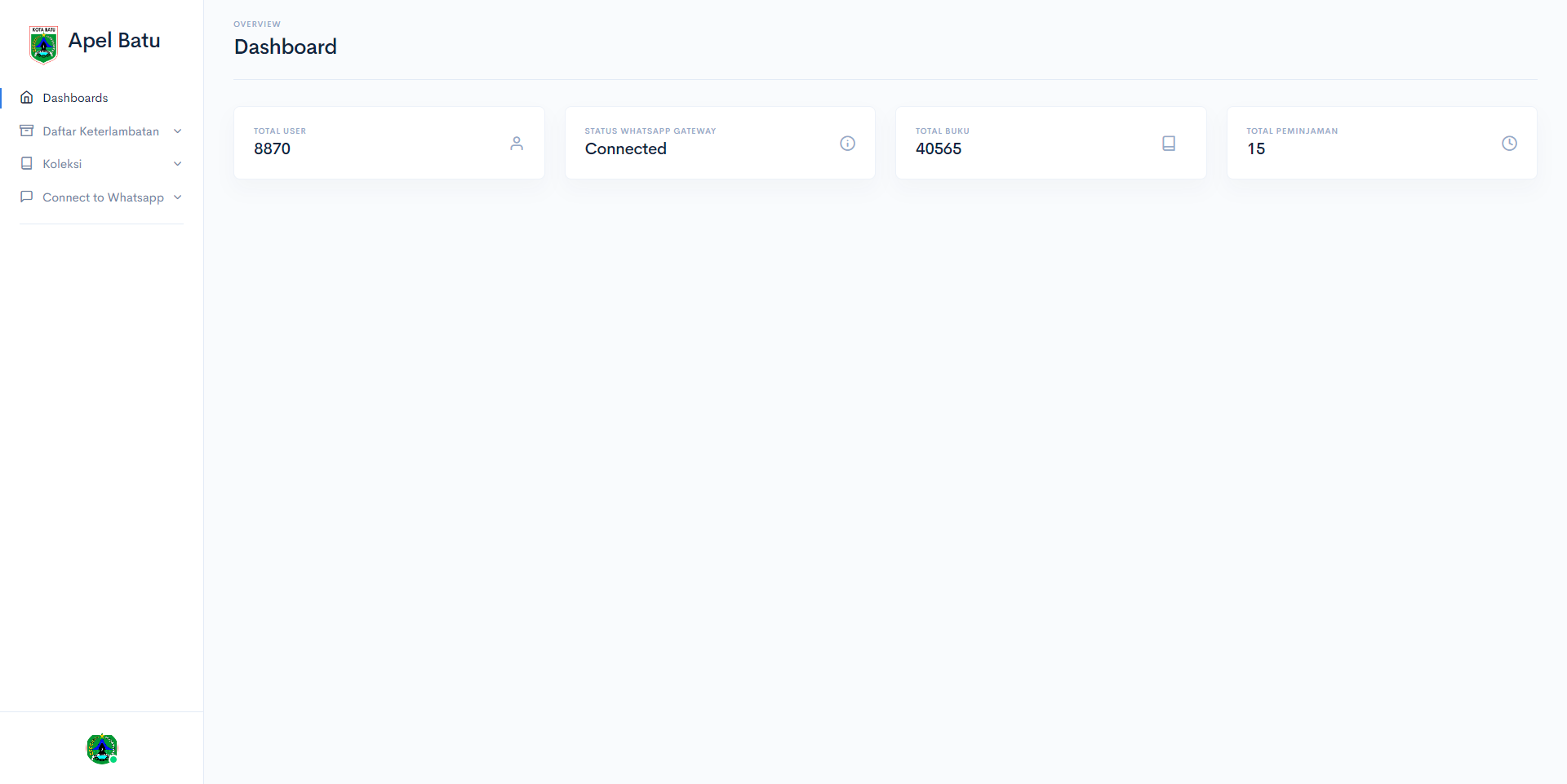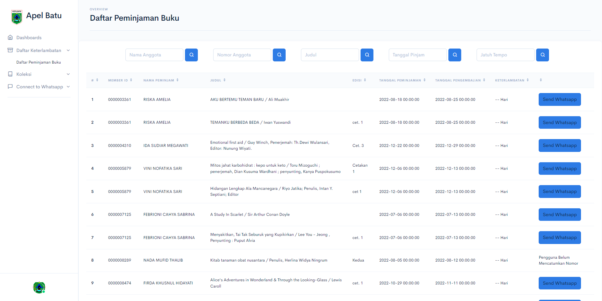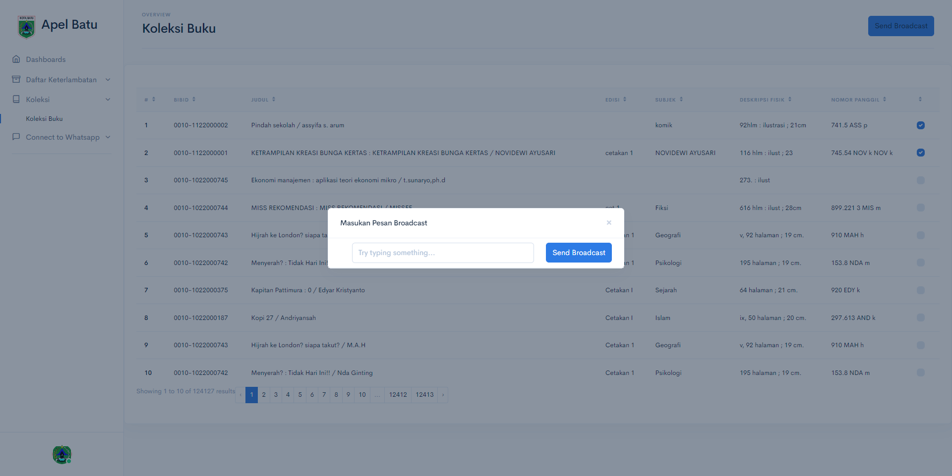 Dari permasalahan tersebut dibuatlah aplikasi WhatsApp Gateway yang bernama Apel Batu yang menyediakan fitur reminder pengembalian buku agar anggota mengembalikan buku tepat waktu. Selain itu sistem ini juga menyediakan fitur promosi buku dan broadcast informasi melalui WhatsApp.